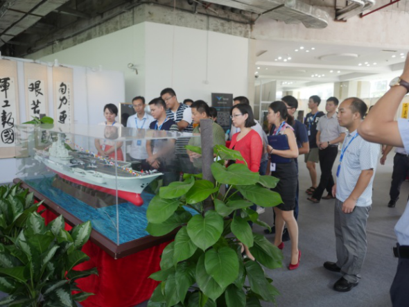 本次展覽共由“國防書畫”、“國防工業史話圖文”和“軍事模型”三部分組成。“國防書畫”部分共展出深圳民參軍企業技術及管理人員和社會愛國人士主創的書畫作品111幅。最讓大家感到震撼的是“國防工業史話圖文”部分,在講解員的帶領下,我們從“歷史篇、建國篇、改革篇、夢想篇、氣節篇”五個方面,回顧了熱兵器戰爭以來我國國防工業發展的宏大歷程,親身感受了中國武器裝備如何實現由“萬國造”到“中國造”的偉大轉變。此外,貫穿整個展覽之中的“軍事模型”部分則展示了國產海陸空天武器裝備的最新成果,如殲115、殲31、遼寧艦等,為大家帶來了不一樣的視覺盛宴,同時也讓大家為祖國國防科技力量的壯大感到驕傲和自豪。