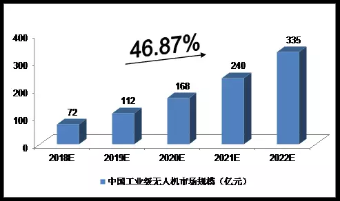 市場規(guī)模預(yù)測 綜合以上因素,我們預(yù)計(jì),2018年中國工業(yè)級(jí)無人機(jī)市場規(guī)模將達(dá)到72億元,未來五年(2018-2022)年均復(fù)合增長率約為46.87%,2022年中國工業(yè)級(jí)無人機(jī)市場規(guī)模將達(dá)到335億元。