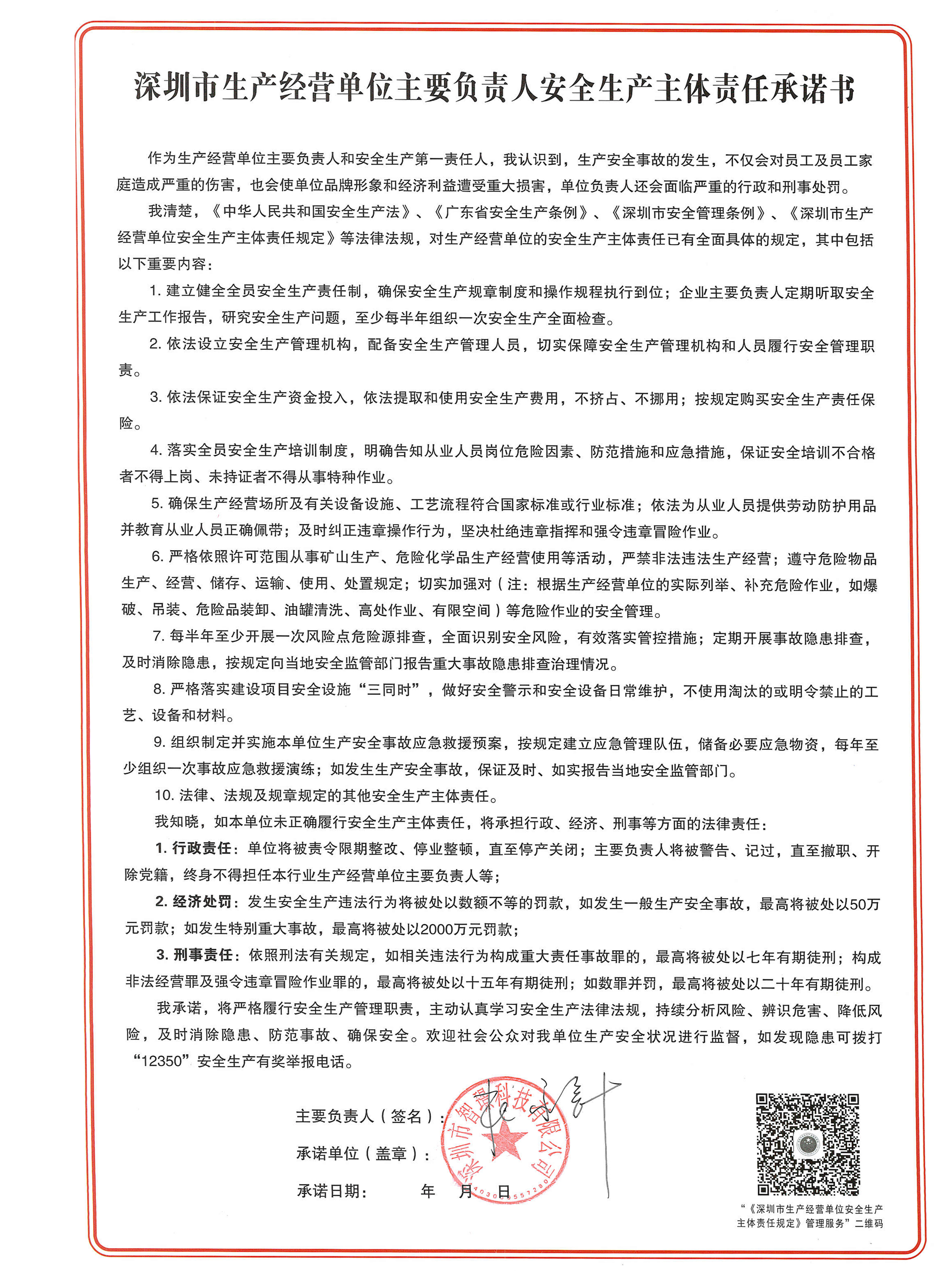 智璟科技簽署《深圳市生產(chǎn)經(jīng)營單位主要負(fù)責(zé)人安全生產(chǎn)主體責(zé)任承諾書》