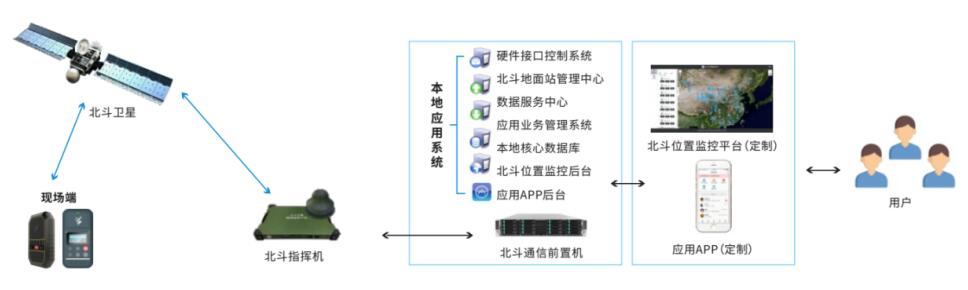 ① 中心端軟硬件系統(tǒng)包括1-北斗指揮機、2-北斗衛(wèi)星收發(fā)單元,3-本地應(yīng)用系統(tǒng)、4-北斗RDSS專用服務(wù)器、5-北斗監(jiān)控平臺與APP五大部分組成;