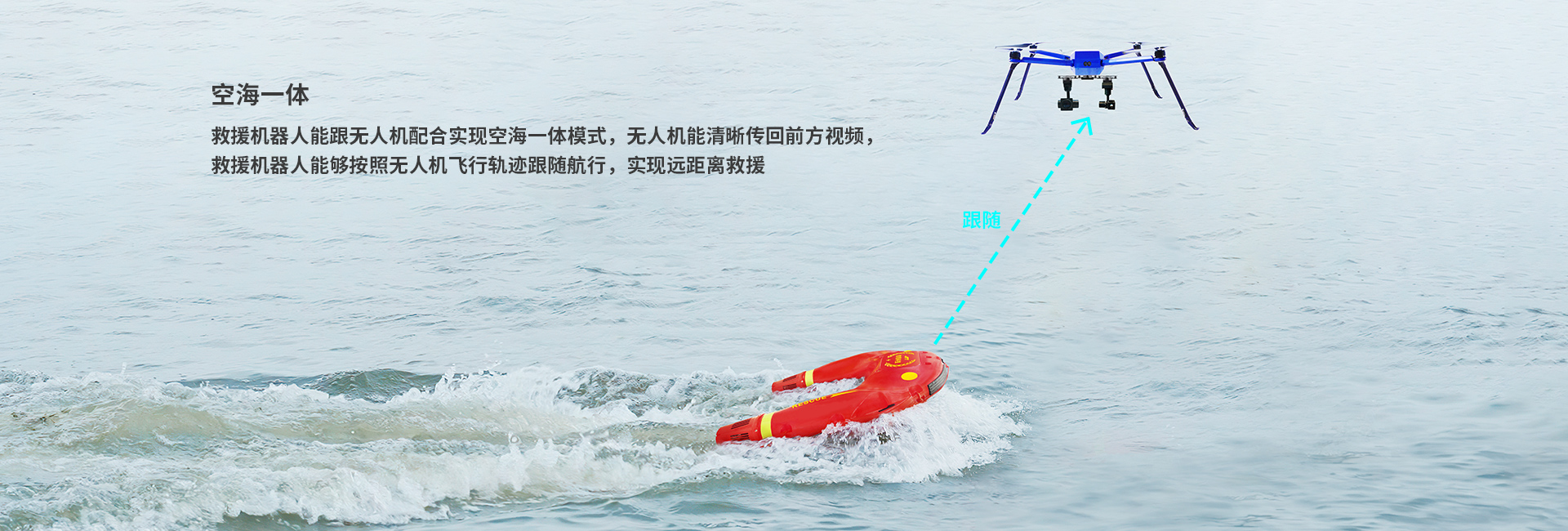 · 與無人機形成空海一體模式,自動執行跟隨模式,無人機能清晰傳回前方視頻,救援機器人能夠按照無人機飛行軌跡跟隨航行,實現遠距離救援;
