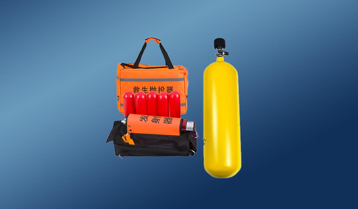 遠距離拋投器標準配置為:基本發(fā)射組件一套、內(nèi)置1.5L氣瓶一個、底座一個、陸用彈體2個(內(nèi)含救援繩索)、水用彈體2個(內(nèi)含救援繩索)、訓練彈一個、沖繩器一個、救援彈發(fā)射導管一根、訓練彈發(fā)射導管一根、繩包3個(其中一個含150m繩索)、16克CO?氣瓶4個、觸發(fā)劑4個、水用保護套2套、常用密封圈一套、鋁合金箱1個、手動回收線盤1個、減壓吹繩器1個、外接充氣接頭1根、可折疊三爪錨鉤1個