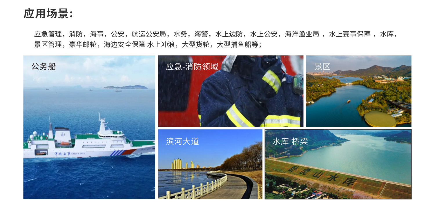 應(yīng)用領(lǐng)域: 應(yīng)急管理,消防,海事,公安,航運(yùn)公安局,水務(wù),海警,水上邊防,水上公安,海洋漁業(yè)局 ,水上賽事保障 ,水庫(kù),景區(qū)管理,豪華郵輪,海邊安全保障 水上沖浪,大型貨輪,大型捕魚船等。
